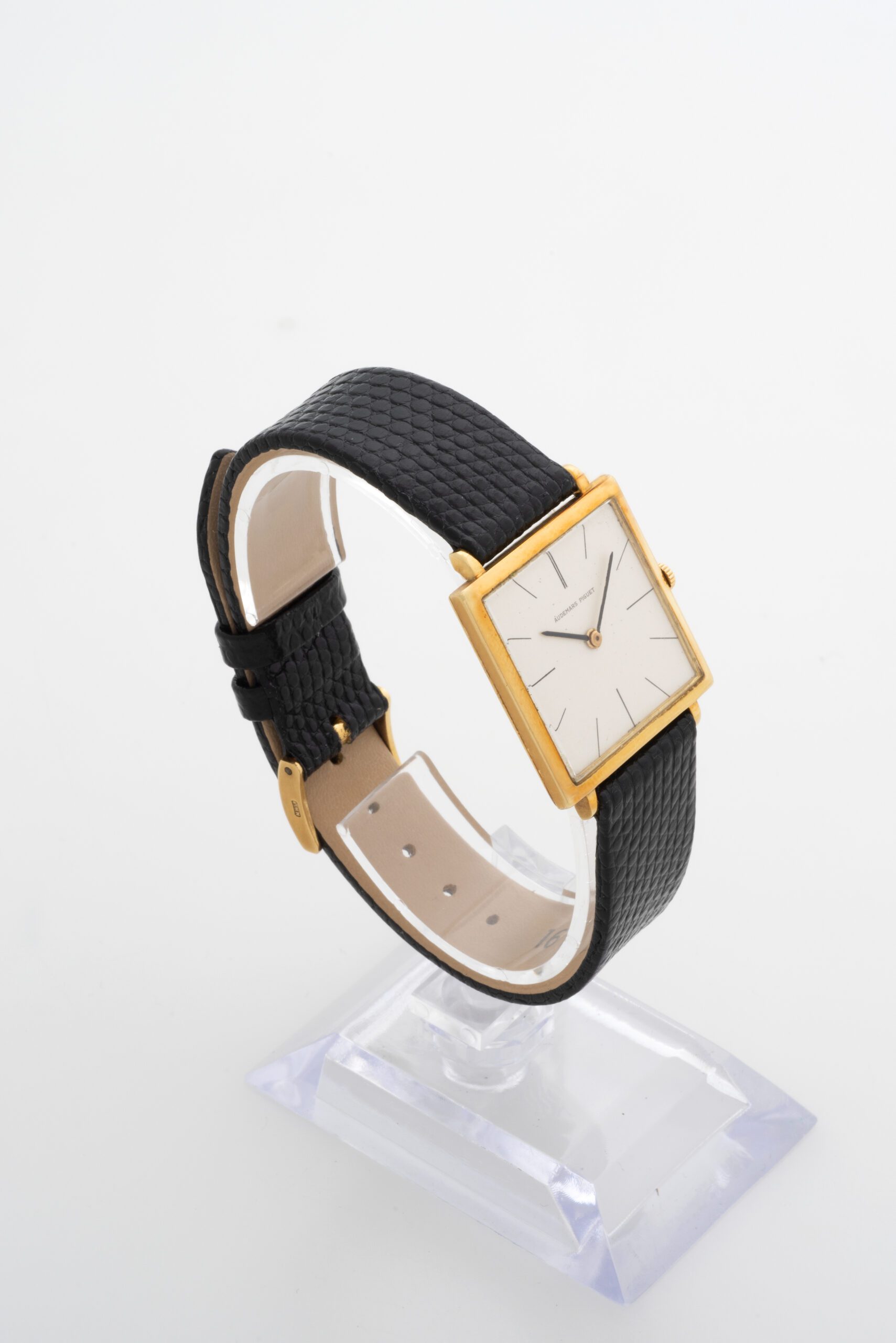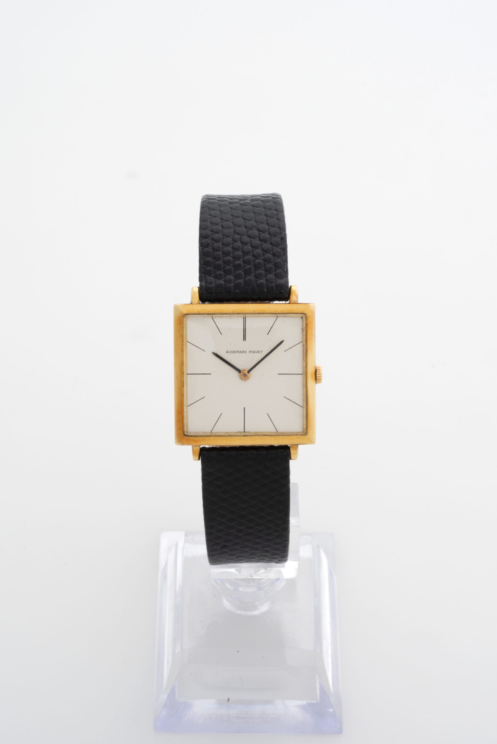 Our vintage and very attractive manually wound Audemars Piguet Ultrathin features a yellow gold 18ct square case of 25mm x 25mm exc crown and lugs which measures just 4.7mm thickness. A superb dress watch with classic dimensions for a man or equally a modern ladies watch, this has a new quality strap fitted and the 18ct tang buckle is hallmarked MW indicating it was likely to have first been retailed by Mappin & Webb London. Neither box nor papers are present, a presentation pouch will be included at point of sale. We date manufacture to c.1960s.