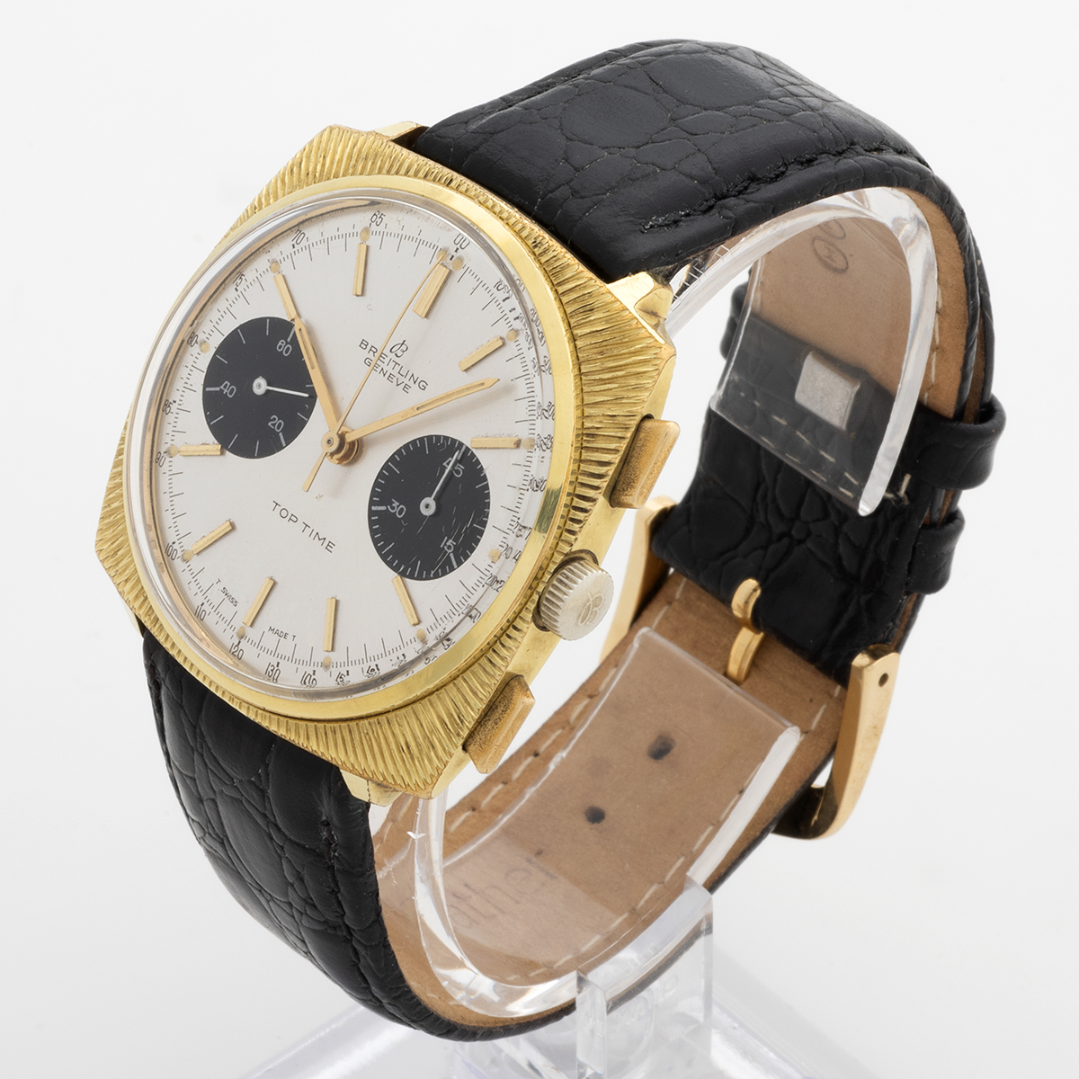 Our vintage and very cool Breitling Top Time reference 2009 features a 37mm gold plated stainless steel case with silver panda dial and manually wound Venus cal 188 movement. Presented in very good condition for its age, we date this Top Time to c.1969. The Top Time was introduced in 1964 designed for a younger audience, and has maintained a cult following ever since. A quality new leather strap has been fitted, neither box nor papers are present, a presentation pouch will be included at point of sale. A very attractive vintage Breitling, perfectly evoking the Space Race era. This would make a great addition to any vintage retro collection.