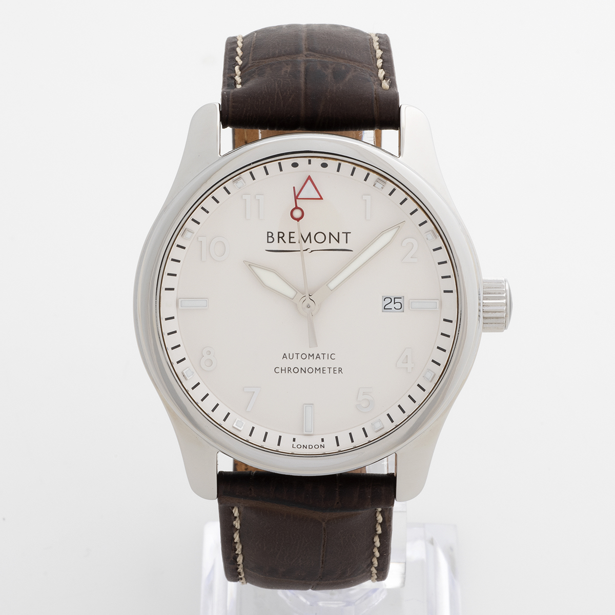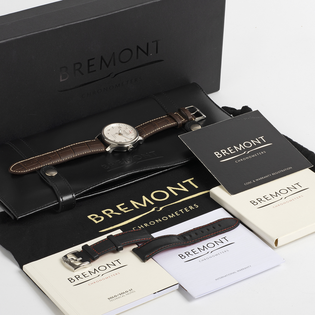 Our Bremont Solo features a 43mm stainless steel case with white dial and date function. A very legible and clearly aviation / pilot inspired design, this example is presented in excellent condition with only light signs of use from new. A new generic quality leather strap is fitted, the original and tang buckle are present, as is its original box, leather pouch, instructions and warranty card, showing it was first realised in 2020 by a Bremont authorised dealer in the UK. This is a great saving over equivalent new (we understand the last RRP was £3450), given this is a discontinued watch with the more desirable original Bremont logo. Please note the box/ leather pouch is black and not blue as photographed : a re-shoot will take place.