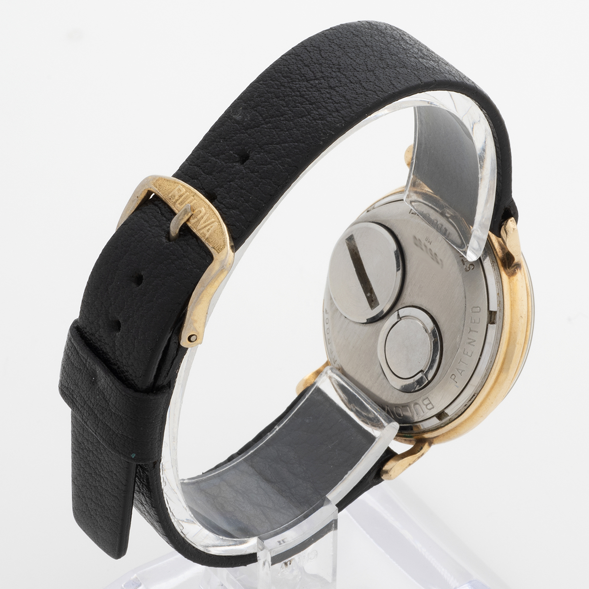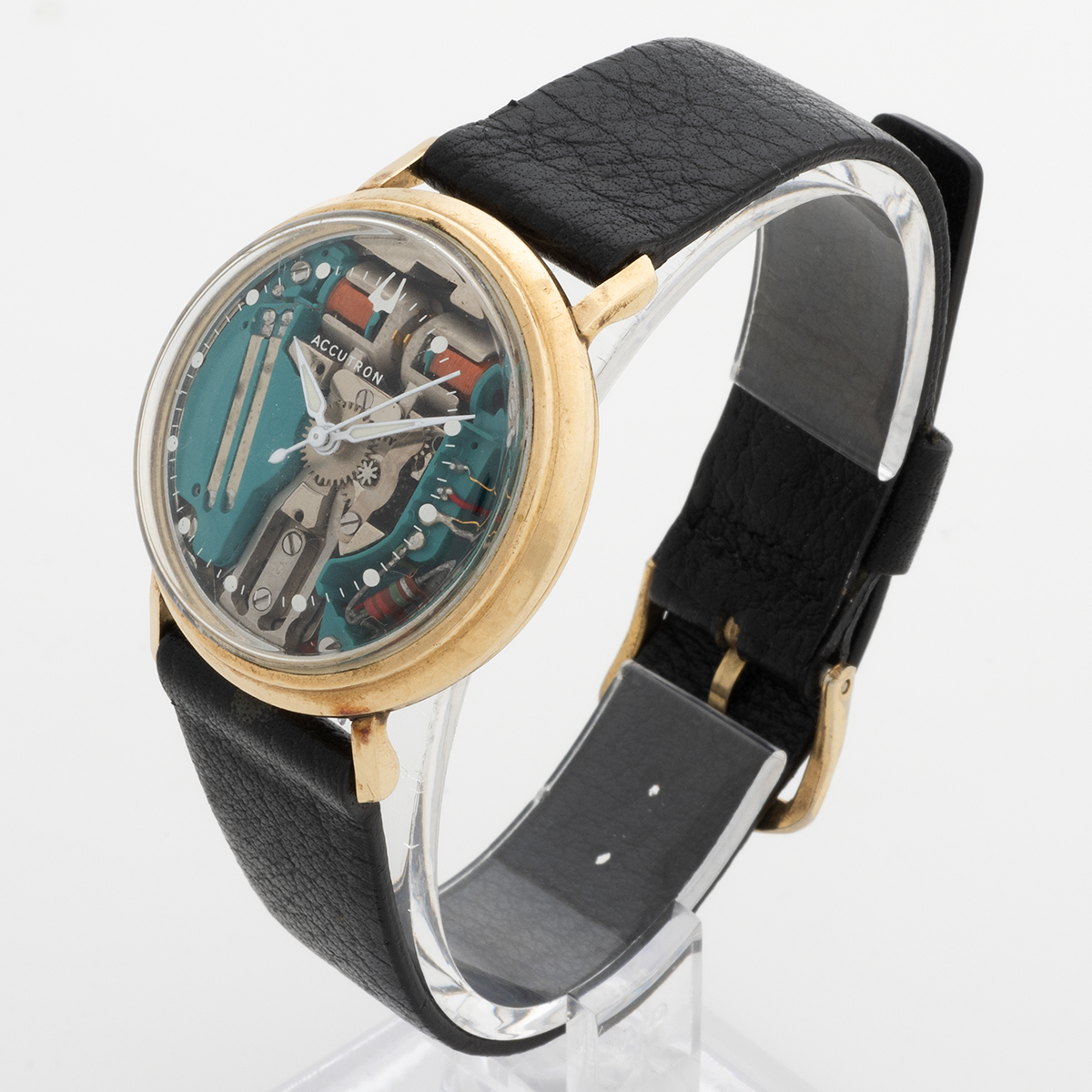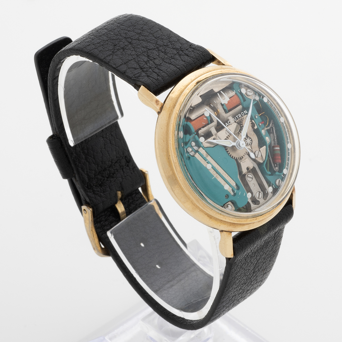 Our iconic Bulova Accutron features a. 35mm gold plated steel case with original leather strap and Bulova tang buckle. Presented in excellent condition with some light signs of use, this is a great example of the world's first electronic tuning fork watch. The movement is visible through the plexiglass. We date this example to c.1968. Neither box nor papers are present, a presentation pouch will be included at point of sale.
