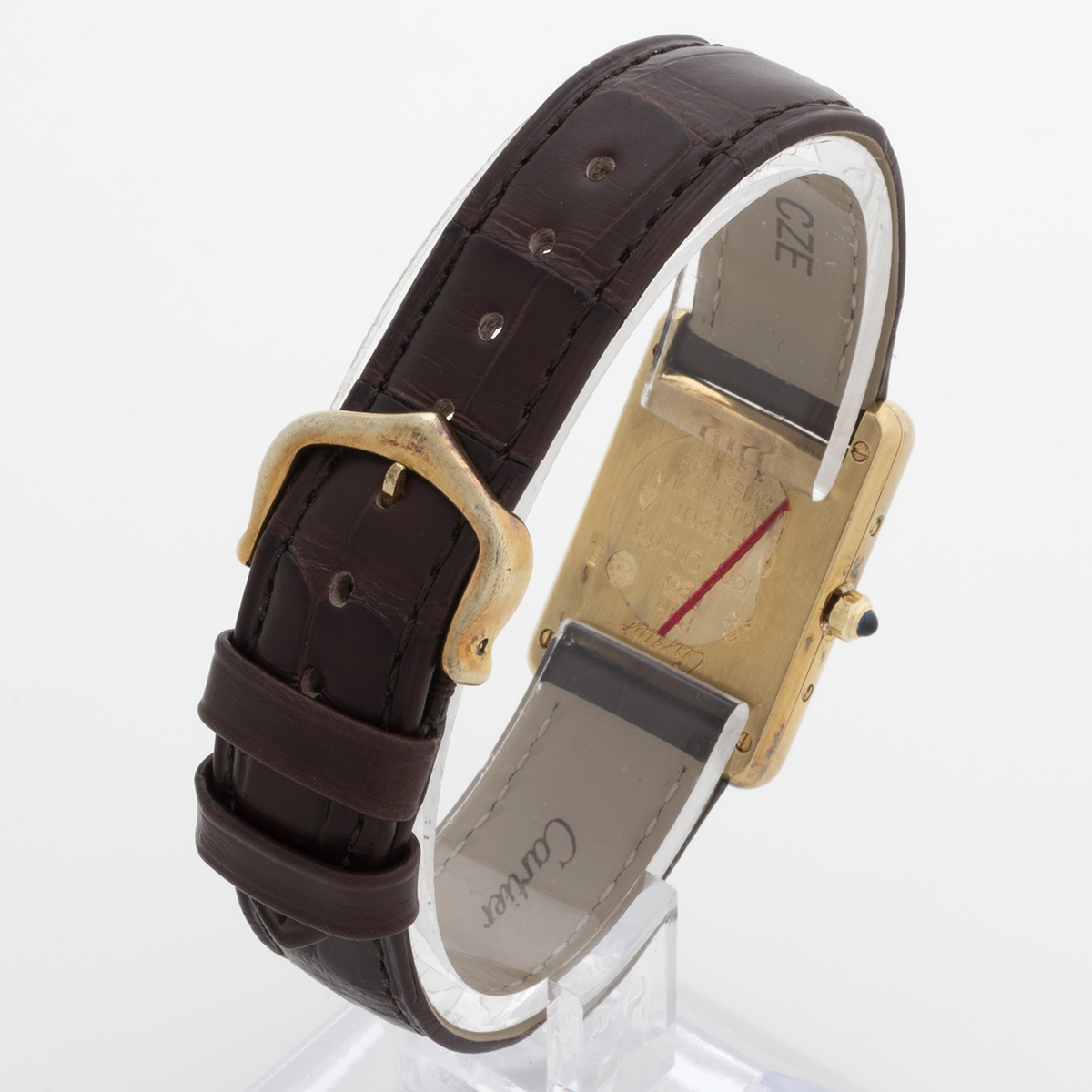 An icon of the 1980s, our vintage Cartier Must De Cartier Tank ref 3660 with quartz movement features a heavy gold plated vermeil silver case , Cartier burgundy dial, gilt hands, a new Cartier burgundy leather strap (with no wear) and gold plated tang buckle. Highly original example, and firmly amongst the best, there is only light patina to the vermeil plating, we date this example to c. 1985 and comes complete with Cartier service pouch. The burgundy dial is one of the rarest variants of the Must De Cartier range, and interest in these 80s Cartier Tanks is growing at an unsurprisingly rapid rate.