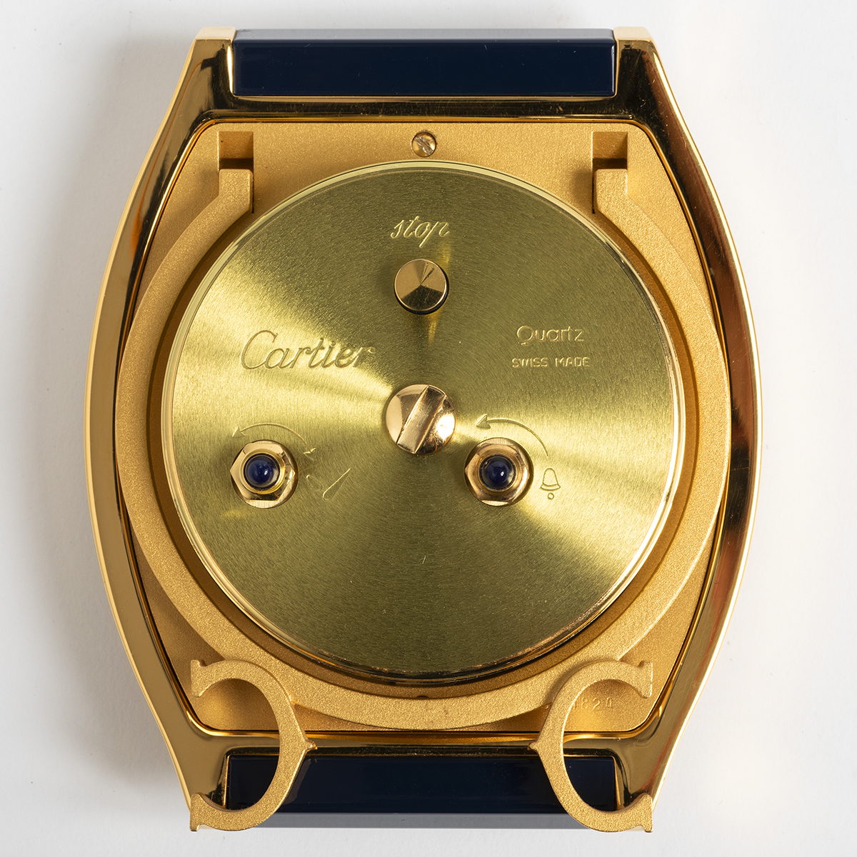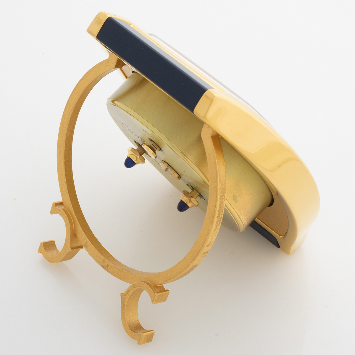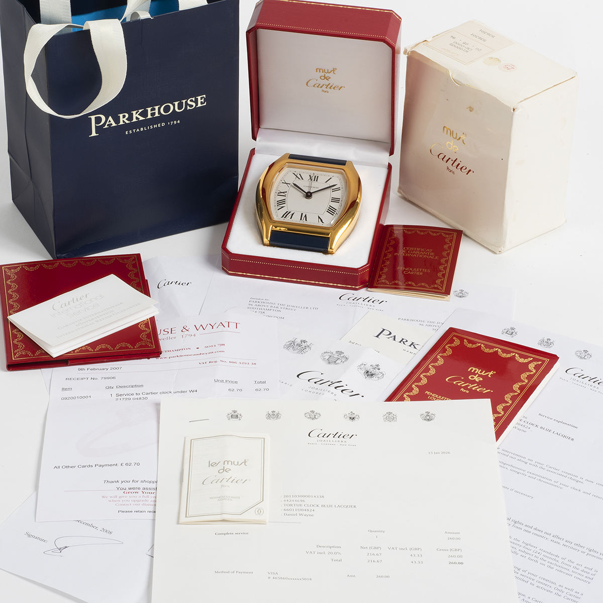 Our vintage and very complete Cartier Must De Cartier Tortue Alarm Clock ( Pendulette ) features a gold plated brass case with blue enamel metal, powered by a battery operated quartz movement. This example is one of the best we have handled, with no notable wear to the gold plating, just light signs of use, to be expected given its age. The Tortue was arguably the most attractive of the 1980s/ 1990s clocks, measures 74mm x 85mm, making it a wonderful addition for a variety of settings including desk/ commercial, curio or bedroom/ dressing room. This Tortue distinguishes itself by its condition, history and completeness as it is a full set comprising outer and inner correct fitted box, sleeve/wallet with warranty certificate showing it was UK retailed in March 1996, service booklet, instructions for pendulettes, redacted service document (Cartier authorised dealer) 2007, guarantee certificate 2008, authorised dealer service receipt and document 2015/6 and carry bag , and Cartier UK Service January 2026, the remainder of the 24 month warranty is in place, at a cost of £260. Over its 30 years this clearly cherished Cartier clock has benefitted from over £500 maintenance at Cartier. We would anticipate this joining a serious Cartier focussed collection.