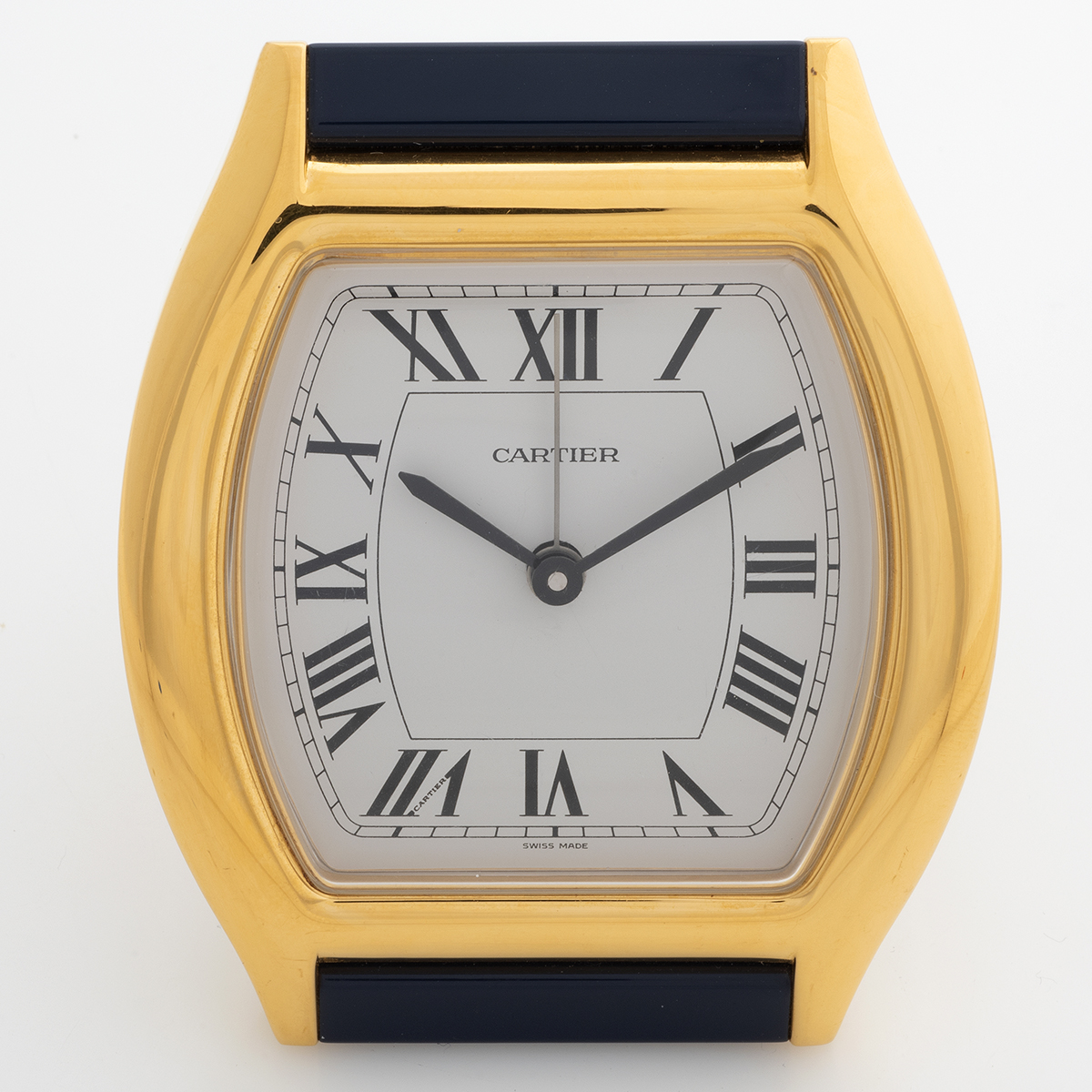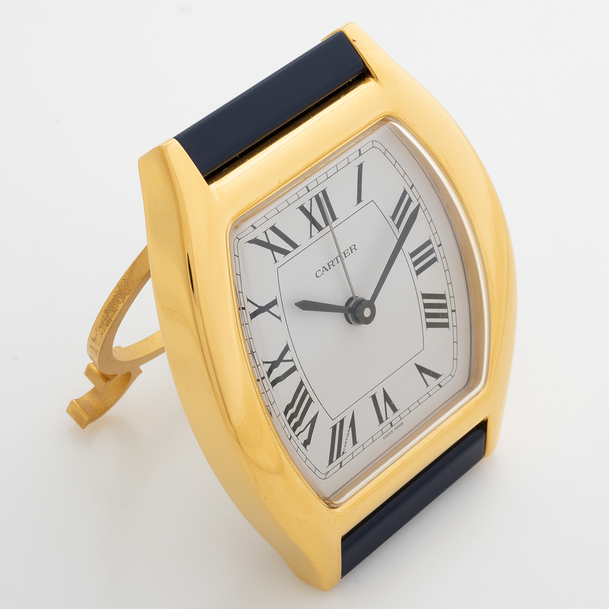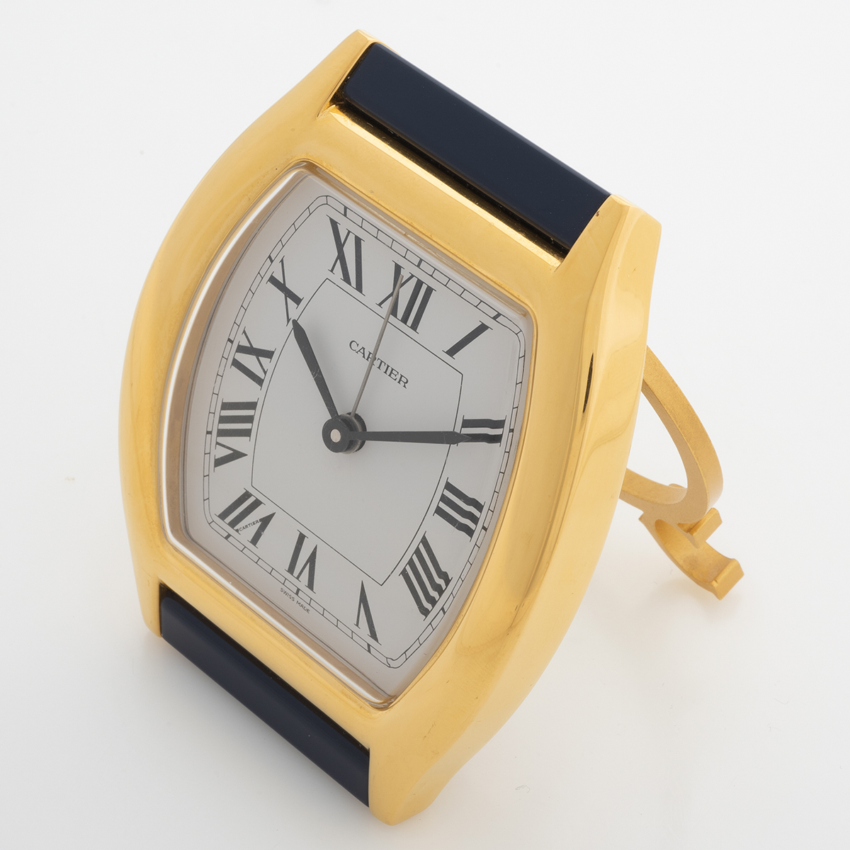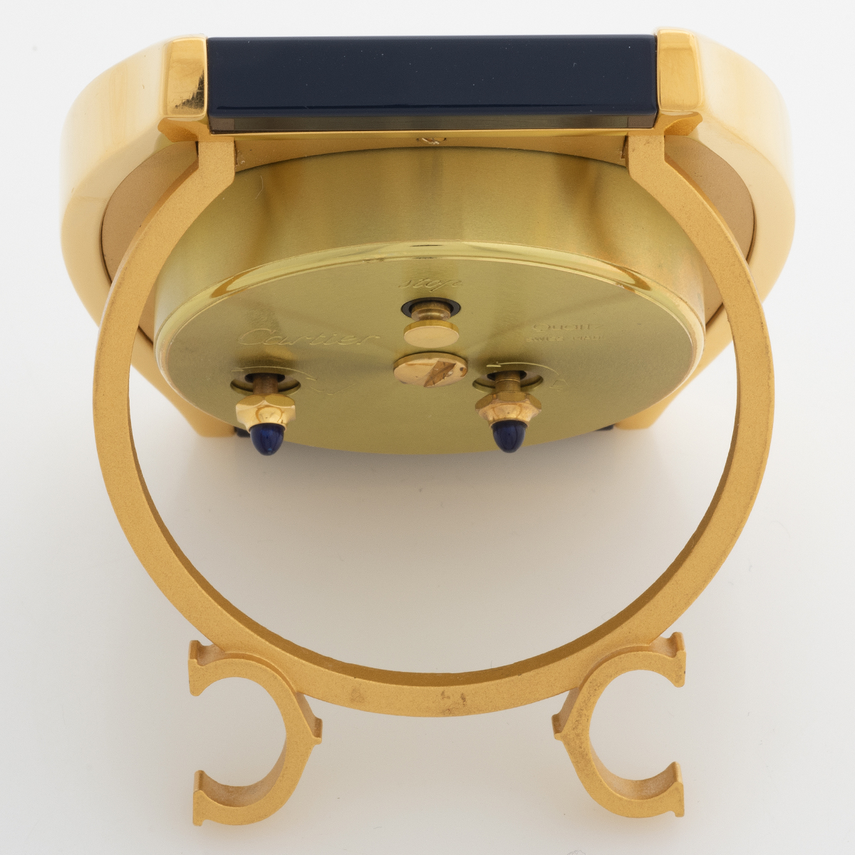 Our vintage and very complete Cartier Must De Cartier Tortue Alarm Clock ( Pendulette ) features a gold plated brass case with blue enamel metal, powered by a battery operated quartz movement. This example is one of the best we have handled, with no notable wear to the gold plating, just light signs of use, to be expected given its age. The Tortue was arguably the most attractive of the 1980s/ 1990s clocks, measures 74mm x 85mm, making it a wonderful addition for a variety of settings including desk/ commercial, curio or bedroom/ dressing room. This Tortue distinguishes itself by its condition, history and completeness as it is a full set comprising outer and inner correct fitted box, sleeve/wallet with warranty certificate showing it was UK retailed in March 1996, service booklet, instructions for pendulettes, redacted service document (Cartier authorised dealer) 2007, guarantee certificate 2008, authorised dealer service receipt and document 2015/6 and carry bag , and Cartier UK Service January 2026, the remainder of the 24 month warranty is in place, at a cost of £260. Over its 30 years this clearly cherished Cartier clock has benefitted from over £500 maintenance at Cartier. We would anticipate this joining a serious Cartier focussed collection.