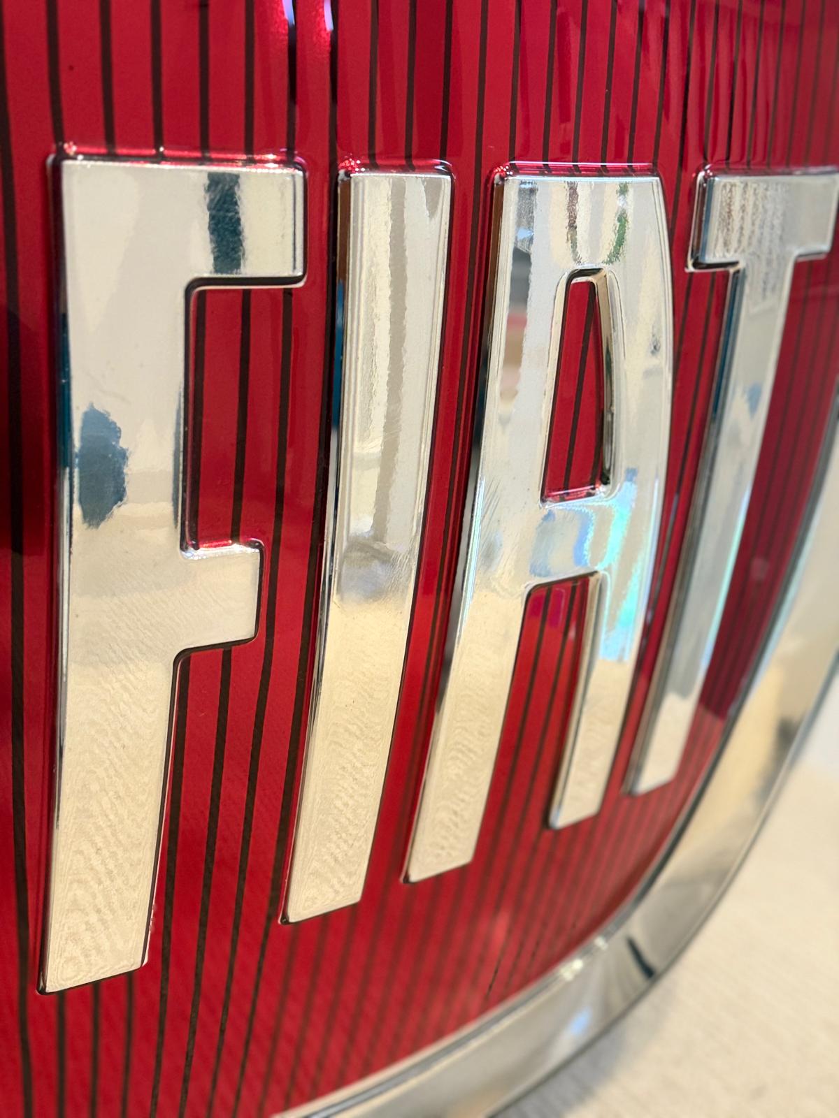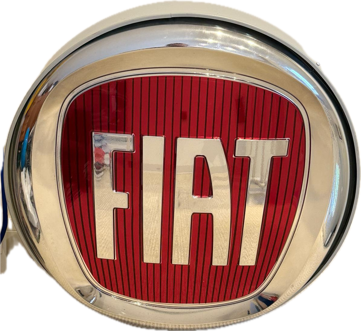 Our Vintage FIAT dealer display sign is made of mixed materials: plastic / metal. Originating from a European dealership (we understand France), a EU plug is fitted but can easily be adapted. The lighting works, to give a low level light source. We date, regarding the logo style, production and use of the sign to c2006. A perfect addition to any motor collection with a focus on Italian cars. There are signs of usage overall, to be expected given its original usage and age. Measurements (approx) 70cm across allowing 15cm for hanging (depth).
