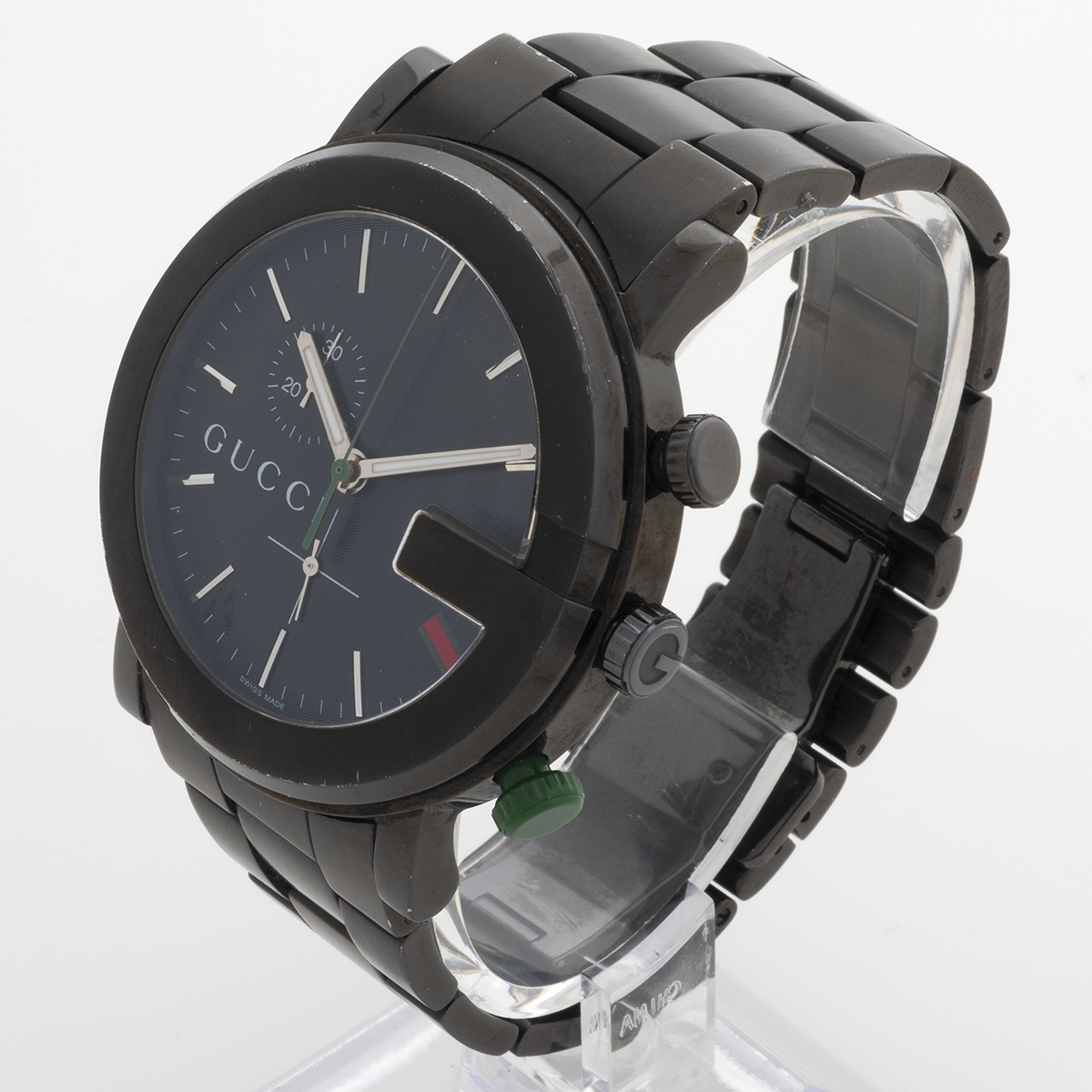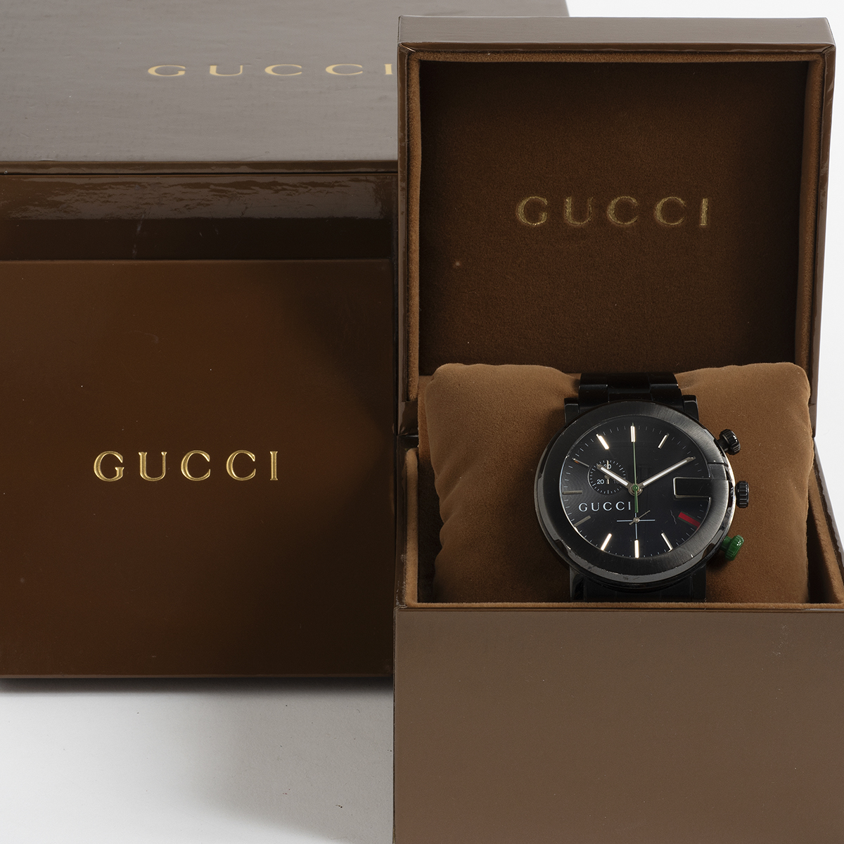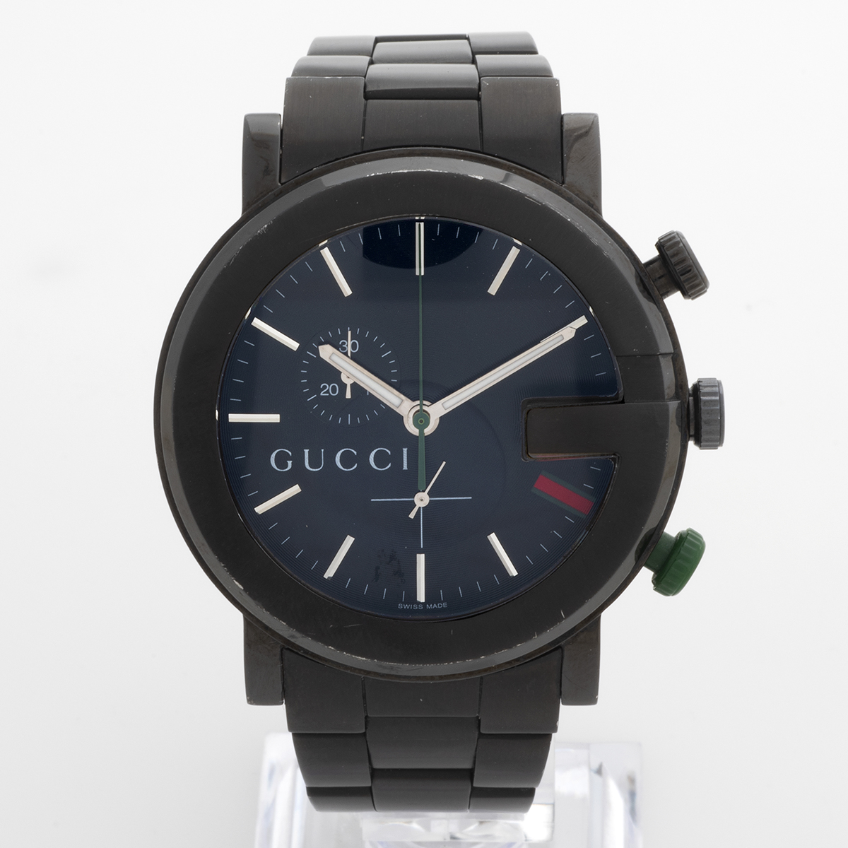 Our unusual Gucci reference 101M chronograph features a black pvd coated stainless steel 44mm G logo case and bracelet, with black dial and red / green Gucci accents to the dial and green lower chronograph pusher. Presented in very good condition with only light marks/ degradation to the coating, our Gucci chronograph comes with inner and outer box, instructions containing open / blank warranty information. A great everyday watch. We date our Gucci 101M's manufacture to circa 2015.
