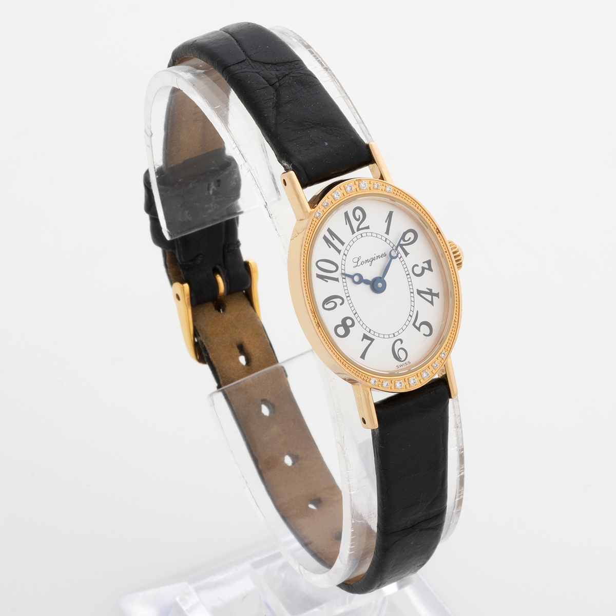 Our attractive ladies Longines Les Ravissantes, reference L5.182.9 is presented in excellent condition. A rare watch, and a homage design to Longines dress watches of the art deco period, this example features a 18mm x 24mm 18k yellow gold oval case set with diamonds and is fitted with its original Longines leather strap (some wear) with Longines gold tone buckle. This quartz Longines comes with service pouch, and we date to circa 2010. Available today at a fraction of what it would have cost new.