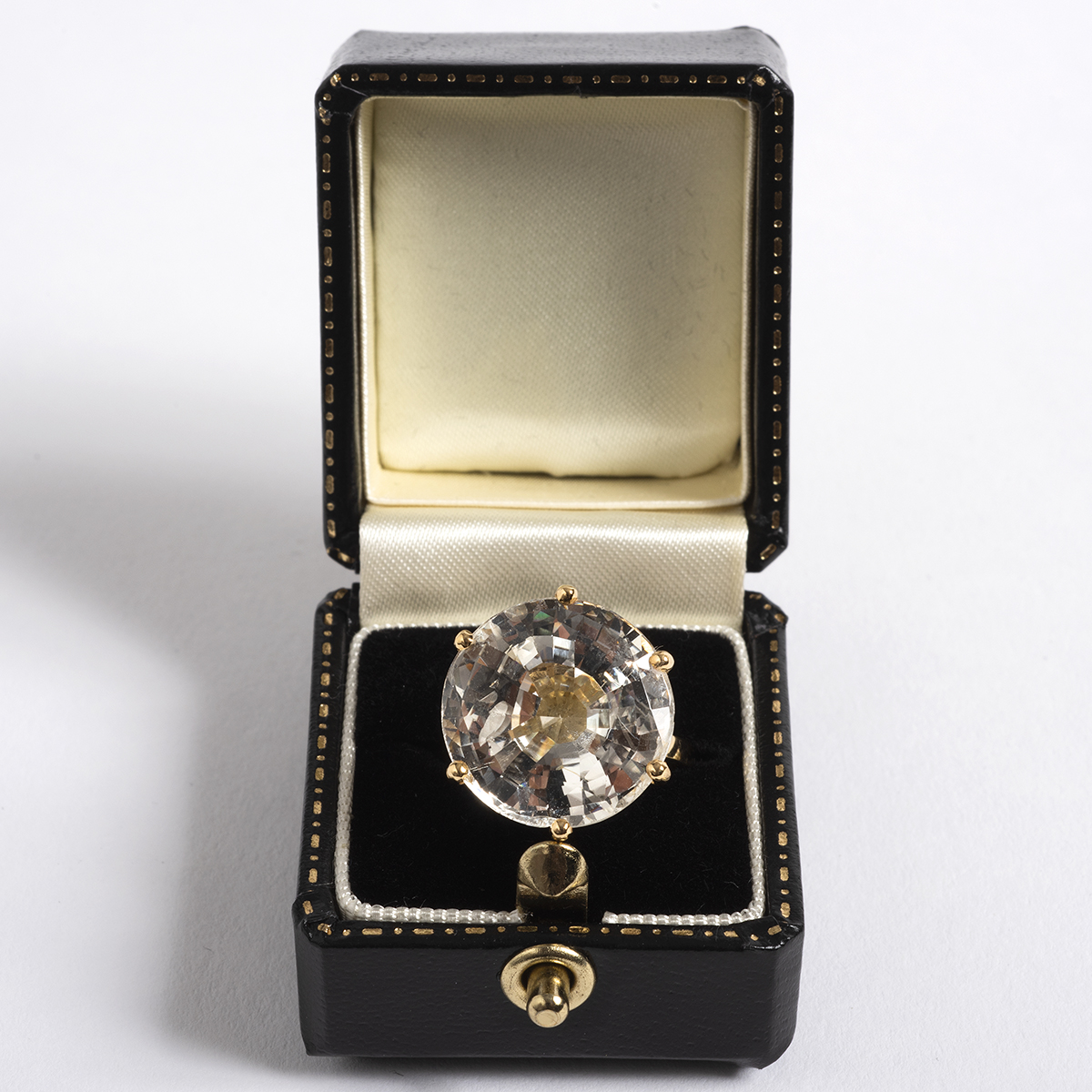 Our phenomenal and large 17.6ct sapphire solitaire ring is fitted to a 18k white gold mount, is a natural colourless stone, and comes with a certificate noting the above characteristics of the sapphire.
