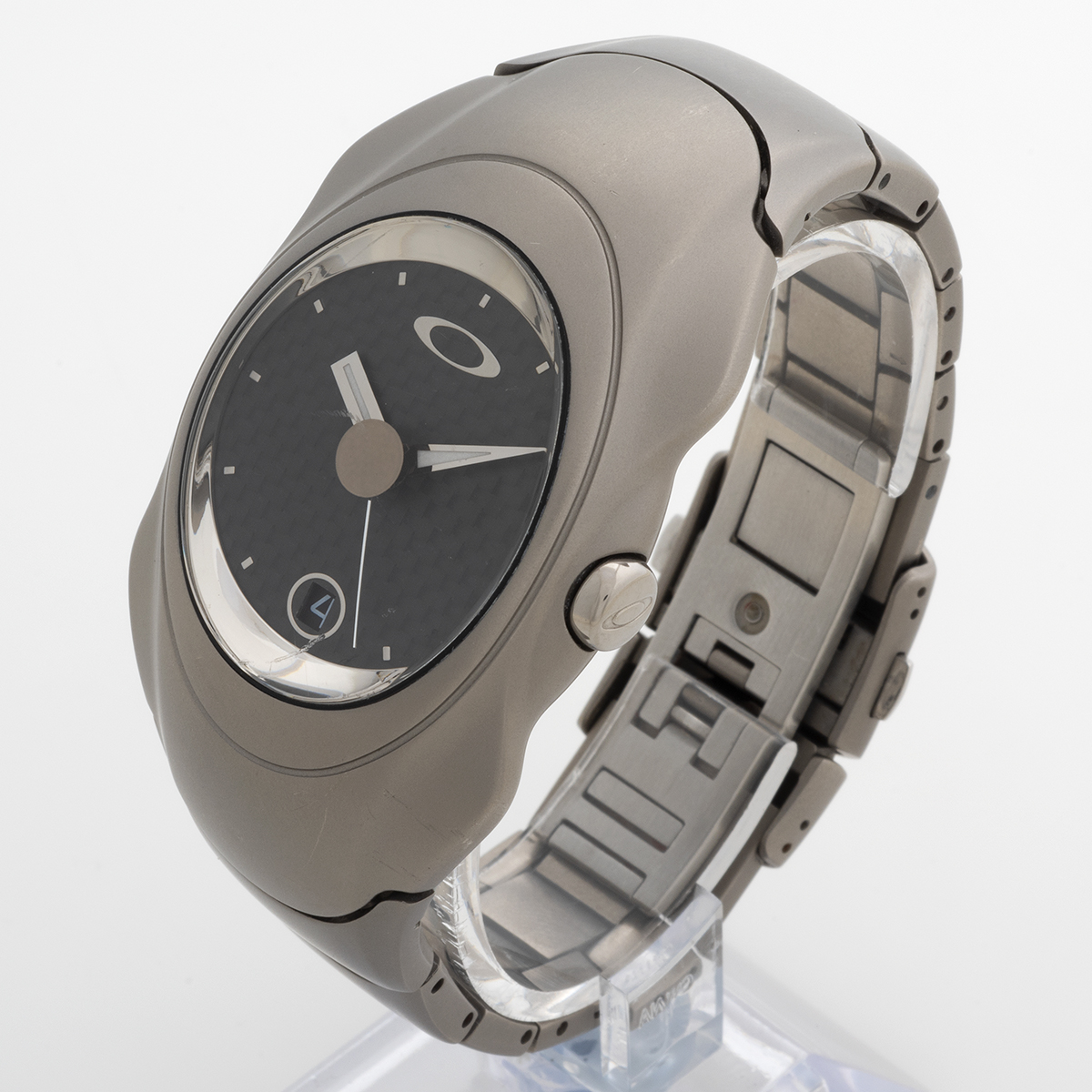 Our iconic and rare Y2K millennium era Oakley Time Bomb is an early example of Oakley's first wrist watch, which was launched in 1998, at $1500, placing it firmly amongst comparable luxury watches. The titanium (X Metal) case is 38mm x 63mm and is ergonomically shaped into the bracelet, the dial carbon fibre effect, very much of the Oakley style. Powered by a kinetic movement, a new capacitor has even fitted as part of its overhaul, pre retail. The condition of this Oakley is good, there are some signs of use overall, notably a scratch to the glass. This will fit a wrist up to c170mm, we have no additional links. Included is its original outer sleeve (1998 Oakley Patent Pending), inner steel box, instruction manual. Given the low serial number 002***, we estimate manufacture to c. 1998. This is the perfect watch for any serious 1990s enthusiast!