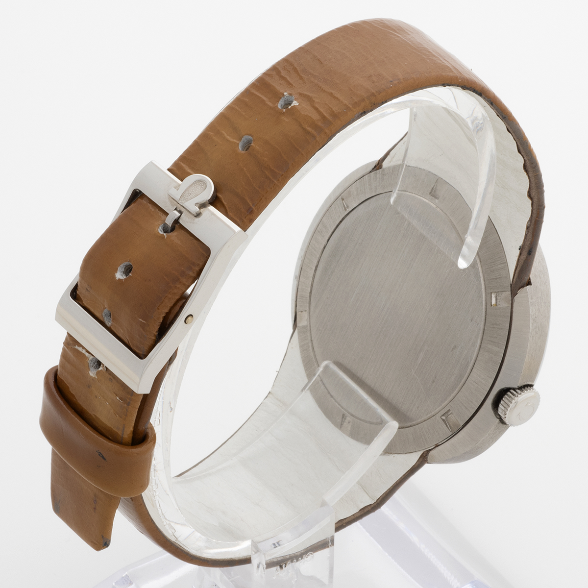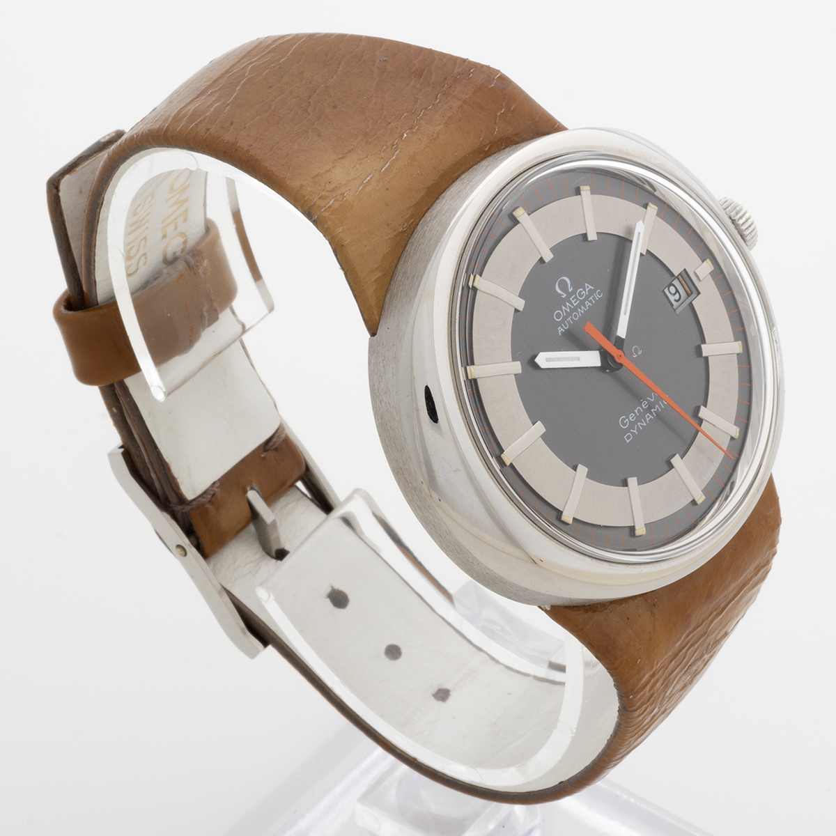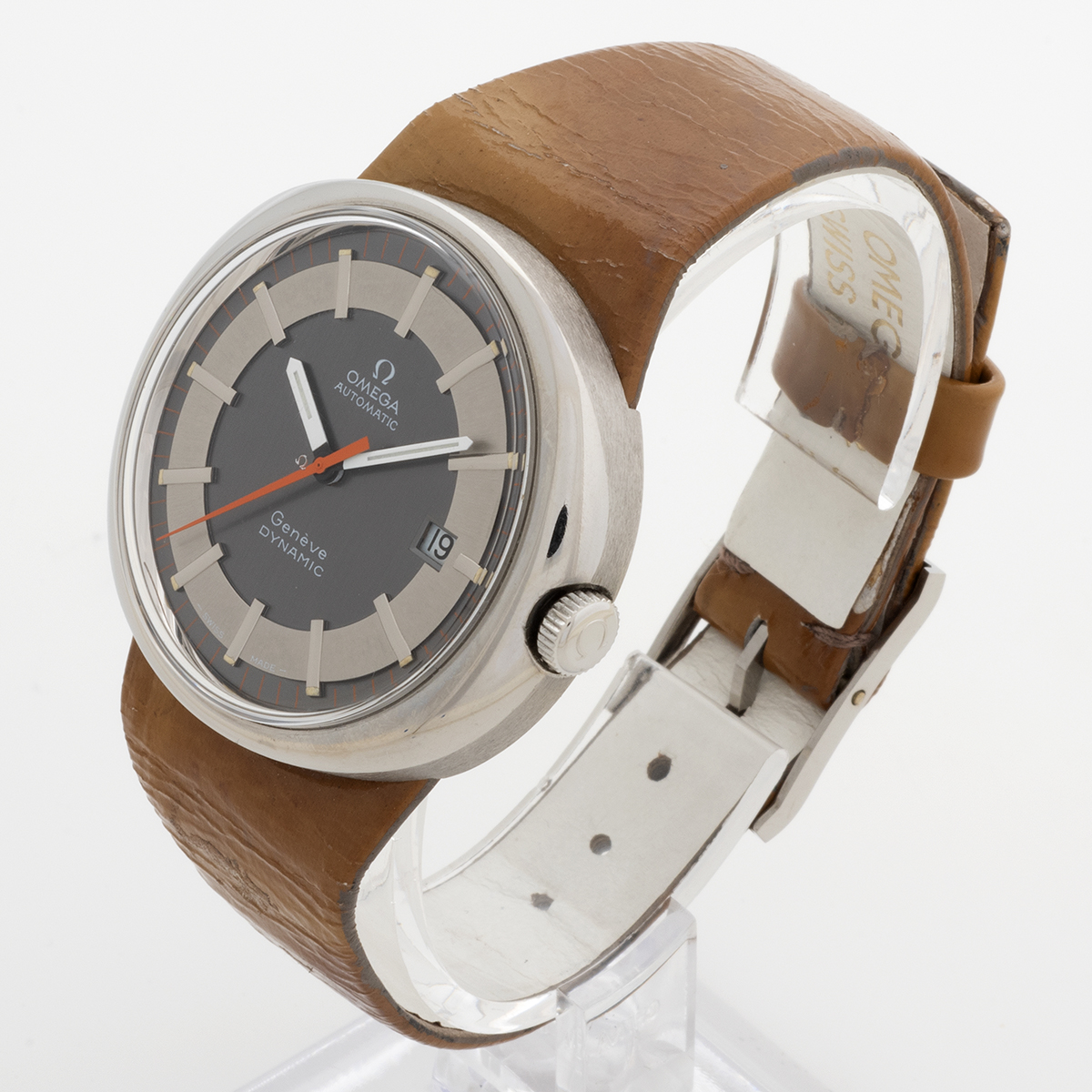 Our vintage Omega Geneve Dynamic automatic features a 40.5mm stainless steel case with very attractive grey / silver dial with orange seconds and seconds hand. This is a superb example of reference 166.0039, serviced and with later quality generic leather strap and stainless steel tang buckle. We date production to c. 1969, neither box nor papers are included, a presentation box will be included at point of sale. This is a great, driver focussed vintage Omega.