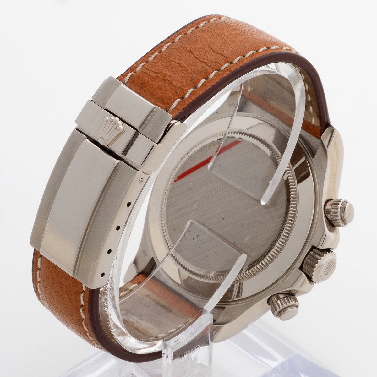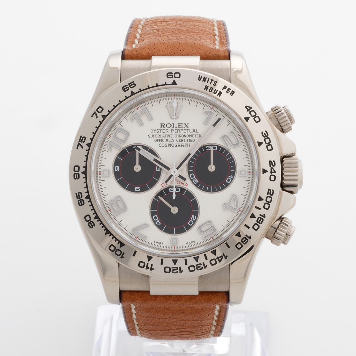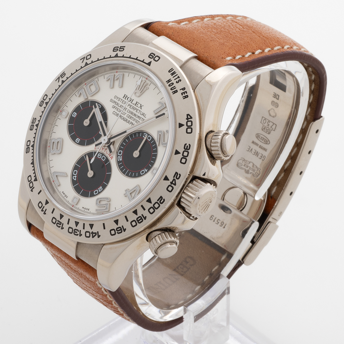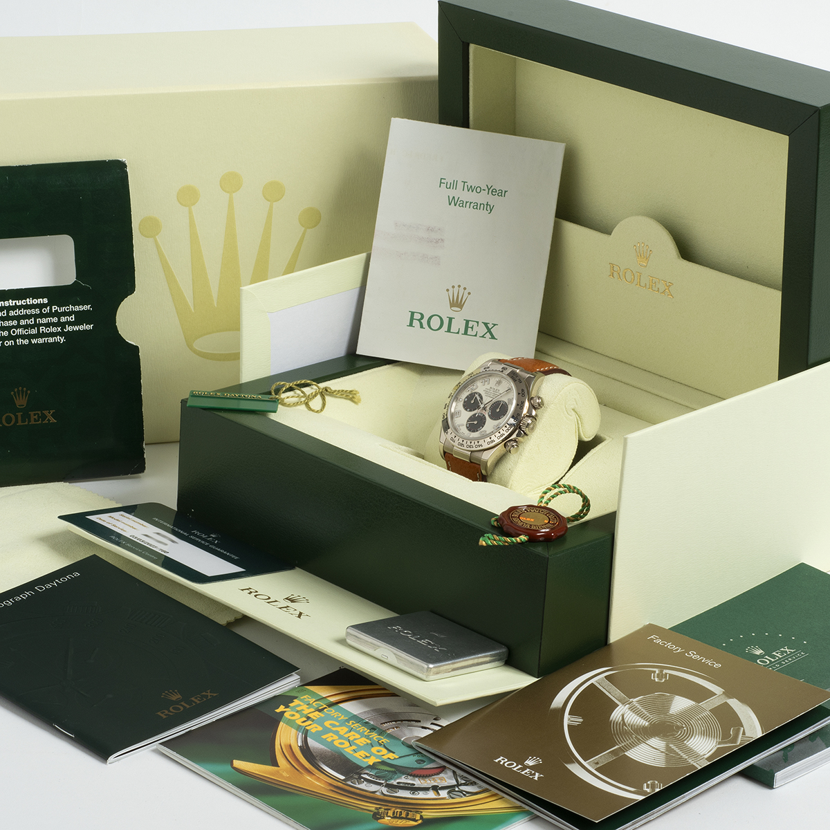 Our iconic Rolex Daytona reference 116519 features an 18ct white gold 40mm case, Racing / Panda dial with Rolex leather strap and 18ct white gold folding clasp. This example is presented in outstanding condition with only light signs of use overall. Included is its original inner and outer box, swing tag with serial and reference / 'strap', red swing tag, factory service booklet, the care of your Rolex booklet, cosmograph Daytona booklet as well as original warranty papers, showing this K *** serial Daytona was first retailed in October 2002 by a recognised Rolex authorised dealer. also included is a Rolex World Service booklet and UK Service centre service card dated 2023, and redacted paperwork showing (possibly uniquely), this Daytona also benefitted from a dial upgrade to "Racing" / "Panda" from its original white Arabic dial. The original dial is also included in its service metal case.