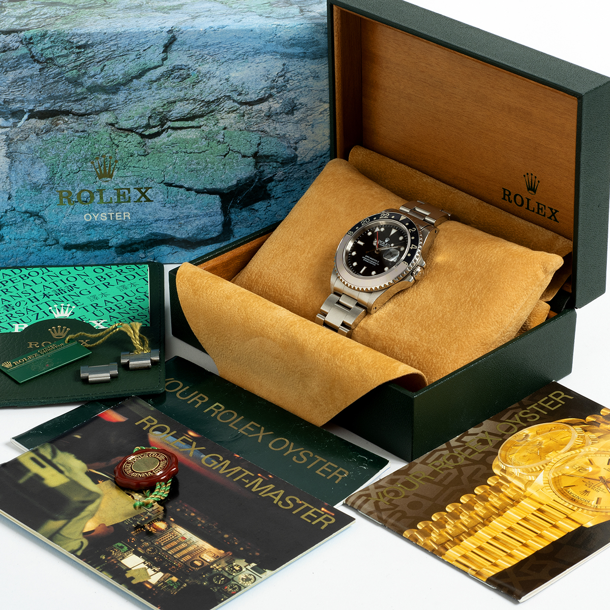 Our Neo vintage transitional Rolex GMT Master II reference 16710 features a 40mm stainless steel case and oyster bracelet. Distinguishing this GMT is its unpolished condition , Swiss only dial and beautifully patinated bezel insert which is the red/ black variant. Included with this A *** serial GMT is its inner and outer box, GMT instructions, swing tag with serial and translation document. The original warranty papers are not present. This is a very attractive GMT of which we date production to 1999 given the dial and serial number.