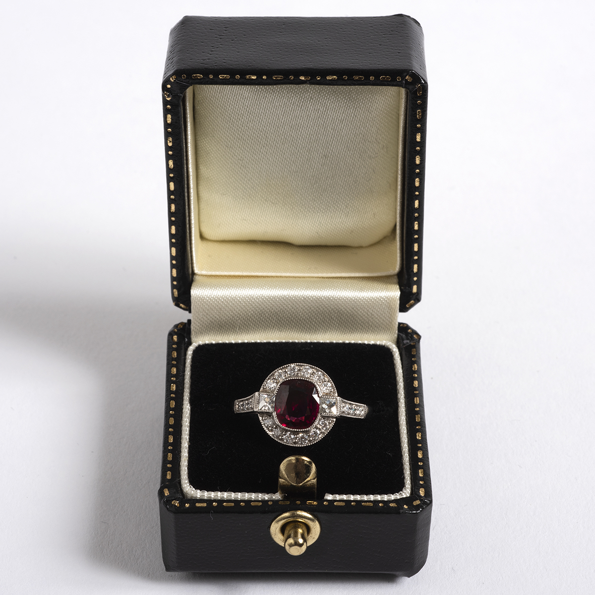 Our beautiful cluster ring features a large ruby (1.07ct) surrounded by diamonds, has a platinum band and is accompanied by a certificate dated 2017, noting the following characteristics: non heated ruby of 1.07ct .