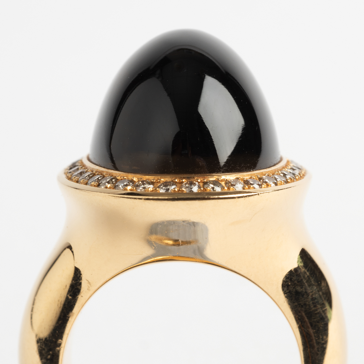 Our rare and large 18k yellow gold dress ring features a phenomenal and noteworthy smokey quartz of considerable dimension, as well as a diamond clad setting. This ring size is O1/2. A unique statement piece for the discerning collector.
