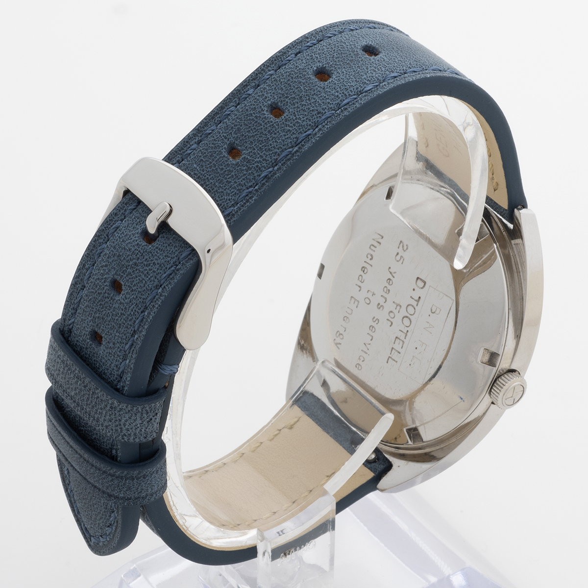 OUr vintage Zenith Autosports 28000 date features a 36mm stainless steel case (exc crown) and is fitted to a generic quality leather strap, powered by a cal 2562 automatic movement. Presented in excellent condition with light signs of use, this example was a presentation watch , on the back is inscribed "BNFL for 25 years service to nuclear energy." BNFL was British Nuclear Fuels Limited, responsible for major nuclear plants. We date production to c.1970. Neither box nor papers are present, a presentation pouch will be included at point of sale. This is a relatively rare Zenith with an interesting back story.